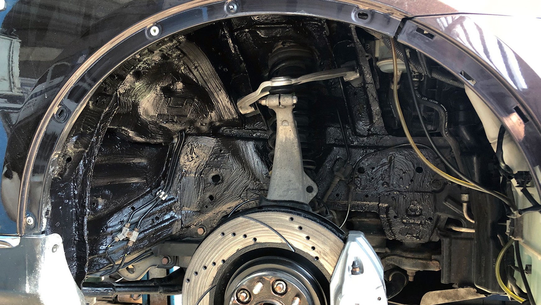 5. Na fabryczną warstwę zabezpieczającą nadkole nakładamy masę wygłuszającą. Wnętrze nadkola powinno być osuszone i wyczyszczone.