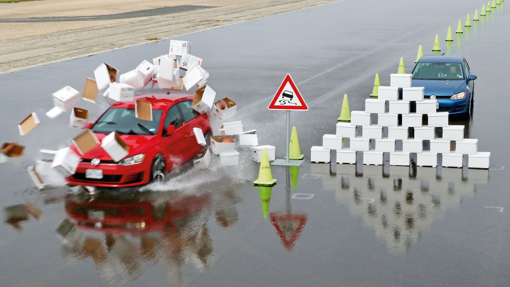 Awaryjne hamowanie na mokrej nawierzchni z prędkości 120 km/h: czerwony Golf ze zużytymi oponami potrzebował o ponad 100 m więcej, by się zatrzymać.