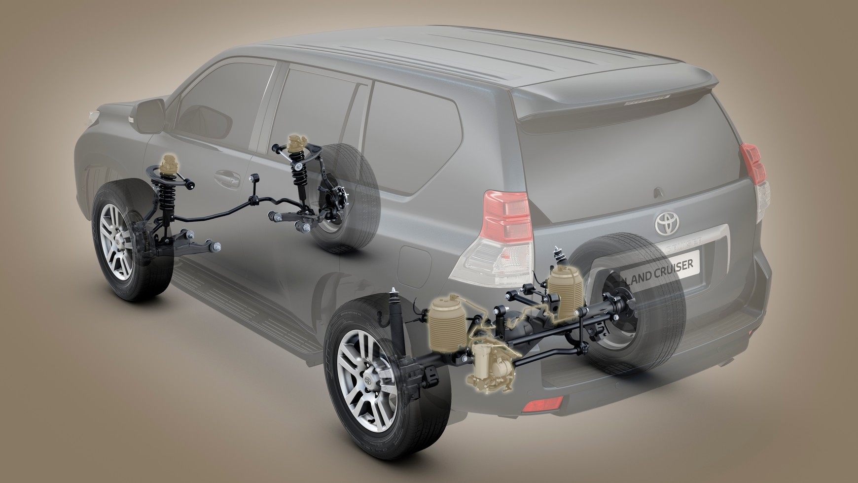 Seryjnie Toyota Land Cruiser ma sprężyny stalowe, opcjonalnie oferowano miechy na tylnej osi. Tu prześwit pozostaje stały.