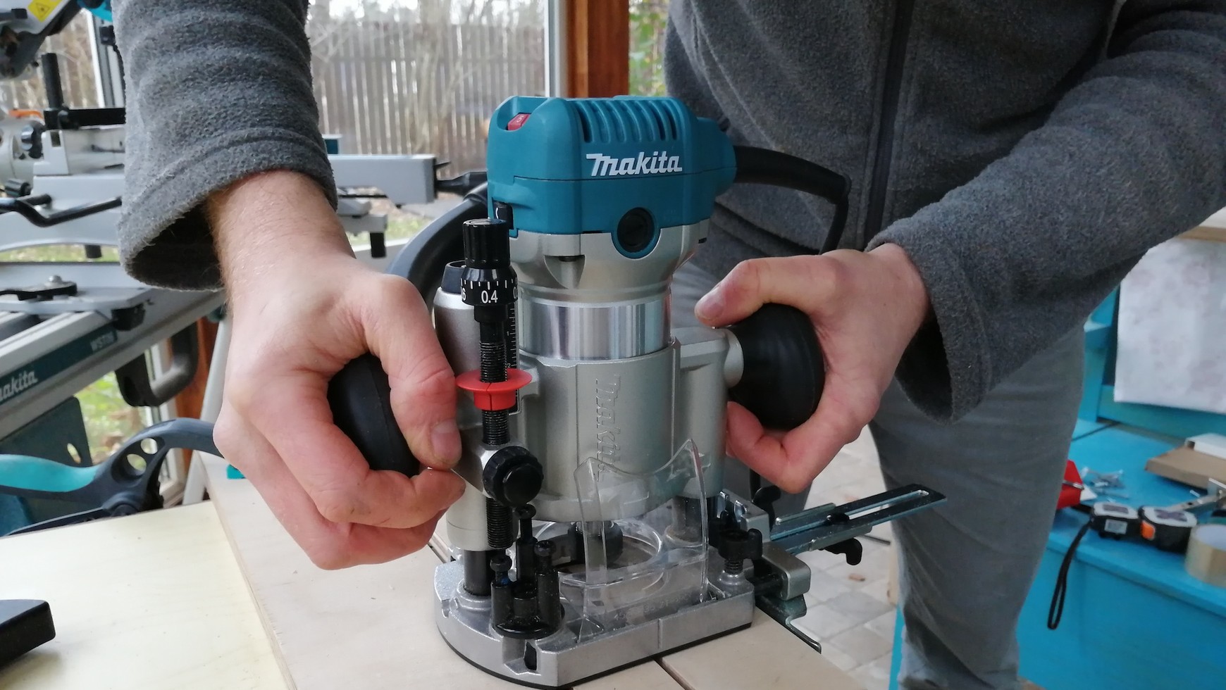 - Precyzyjny ogranicznik/regulator głębokości – pozwala precyzyjnie ustawiać narzędzie, bez tego funkcjonalność frezarki jest mizerna