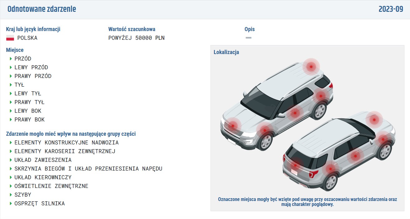 - Historia pojazdu – m.in. informacje o odnotowanych szkodach (np. wypadki, kolizje).