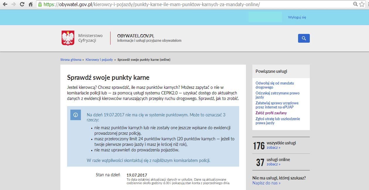 Kolejnym praktycznym i długo wyczekiwanym zastosowaniem, jest wprowadzona w kwietniu tego roku (także bezpłatna), możliwość kontroli aktualnej liczby punktów karnych. Aby to zrobić wystarczy wejść na stronę: http://www.cepik.gov.pl/ lub https://obywatel.gov.pl/