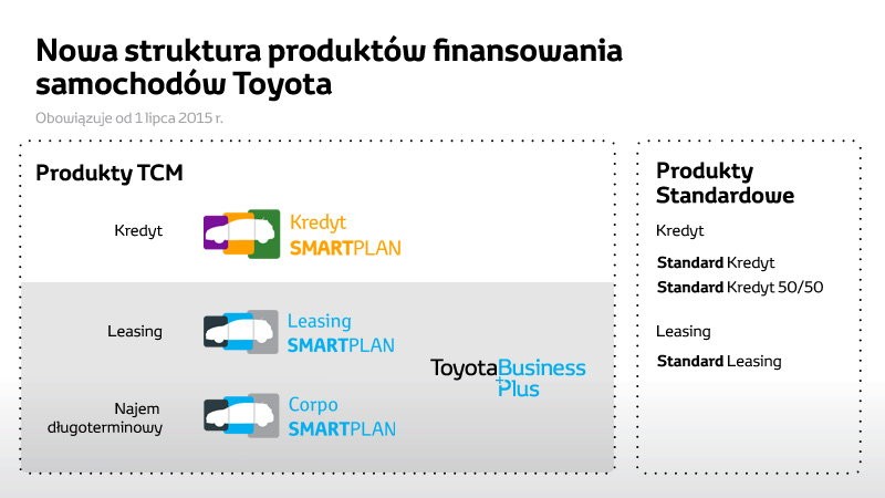 Od 1 lipca 2015 roku, wszystkie produkty typu TCM od Toyota Bank i Toyota Leasing, które oferowane są w salonach Toyota i Lexus na terenie całej Polski, otrzymają nowe nazwy oraz znak graficzny. Produkt skierowany dla sektora MŚP - Toyota Business SmartPlan, będzie teraz sprzedawany pod nazwą Leasing SMARTPLAN w ramach oferty Toyota Business Plus. Kredyt skierowany głównie dla klientów indywidualnych – Niska Rata, zmieni swoją nazwę na Kredyt SMARTPLAN, natomiast program najmu długoterminowego Toyota Business SmartPlan dla korporacji, będzie funkcjonował pod nazwą Corpo SMARTPLAN.