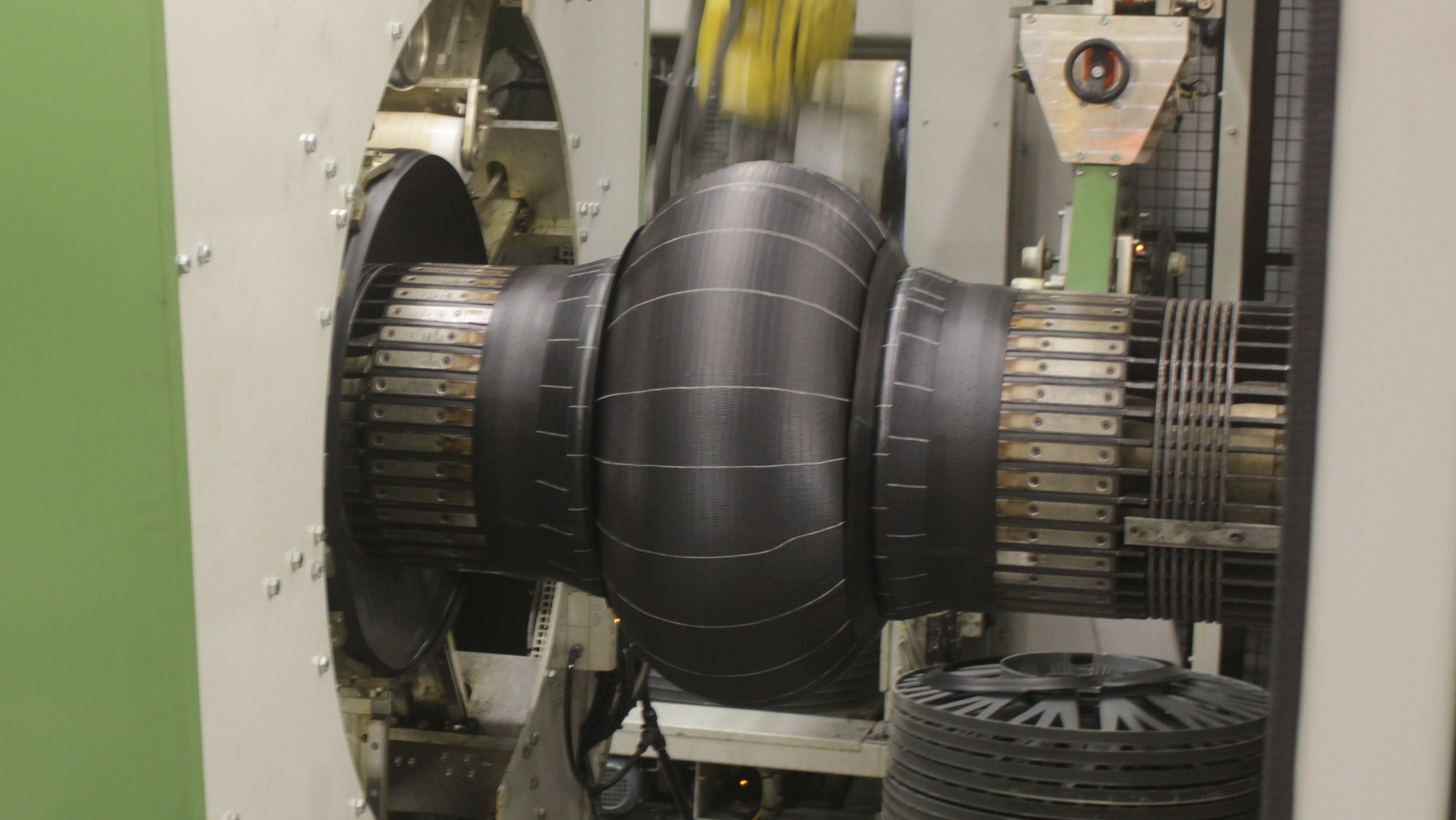 Etap 4.Konfekcja opony. Kolejny etap konfekcji opony to nałożenie boków z elastycznej i wytrzymałej gumy. Tak przygotowane warstwy pod wpływem sprężonego powietrza nabierają charakterystycznego kształtu opony.