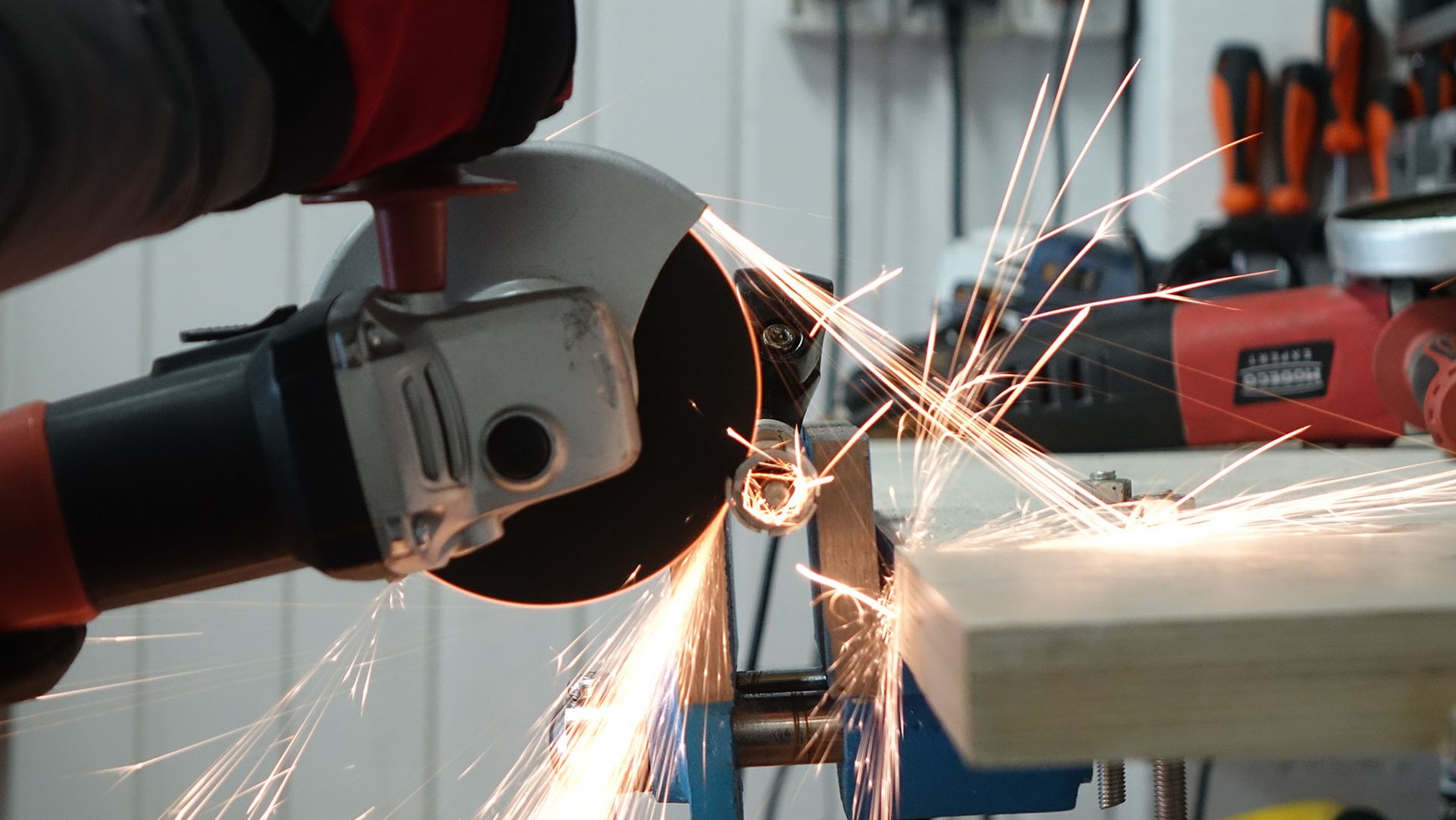Jeśli pracujemy dużą, ciężką maszyną, np. 230 mm o wysokiej mocy (amatorom to jednak odradzamy), należy trzymać ją tak, by w razie zakleszczenia tarczy „odjechała” od nas, a nie żeby próbowała nas uderzyć – nie da się jej w takiej sytuacji utrzymać. Wtedy oczywiście iskry lecą podczas pracy w stronę użytkownika szlifierki, ale naszym zdaniem (niektórzy mają inne) to mniejszy problem. Jeśli zastosujecie się do tych zasad, będziecie bezpieczni.