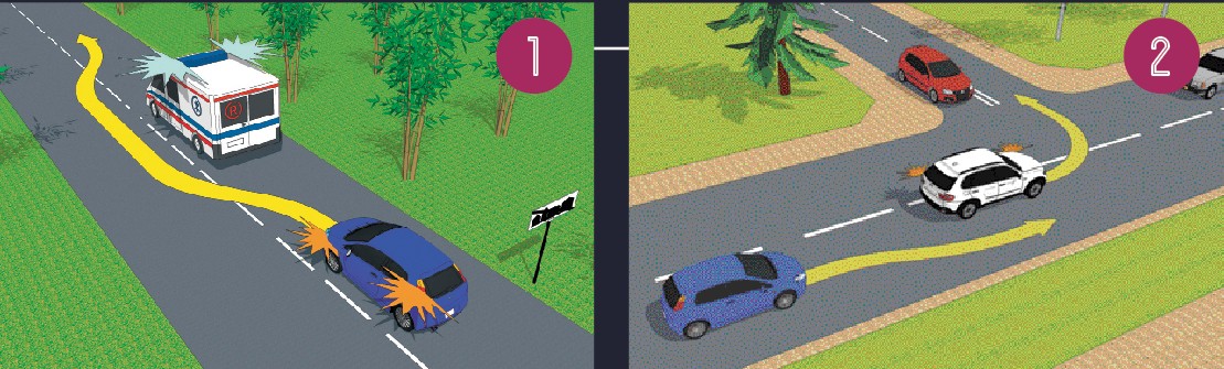 Wyprzedzanie pojazdów uprzywilejowanych – w tym kolumn – jest dozwolone tylko poza terenem zabudowanym (1). Wyprzedzanie na skrzyżowaniach z ruchem niekierowanym? Zabronione! Jednak w tej sytuacji (2) niebieskie auto ma prawo wyprzedzić, gdyby z kolei biały skręcał w prawo, to niebieski również może go wyprzedzić, pod warunkiem że nie wjedzie na część jezdni dla ruchu z naprzeciwka.