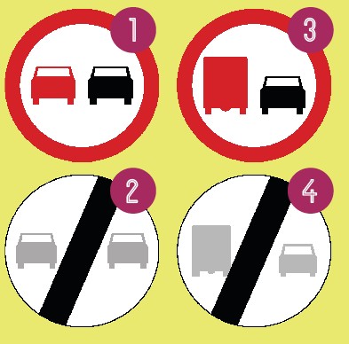 Zasady dotyczące wyprzedzania regulują znaki pionowe i poziome. Zakaz wyprzedzania pojazdów silnikowych (1) dotyczy wszystkich samochodów (w tym ciężarówek) i obowiązuje od miejsca ustawienia do odwołania (2) lub skrzyżowania (uwaga: np. wyjazd z drogi osiedlowej skrzyżowaniem być nie musi!) (2). Zakaz wyprzedzania dla ciężarówek o dmc powyżej 3,5 t (3) spotyka się np. w miastach i na autostradach. Odwołanie zakazu (4).