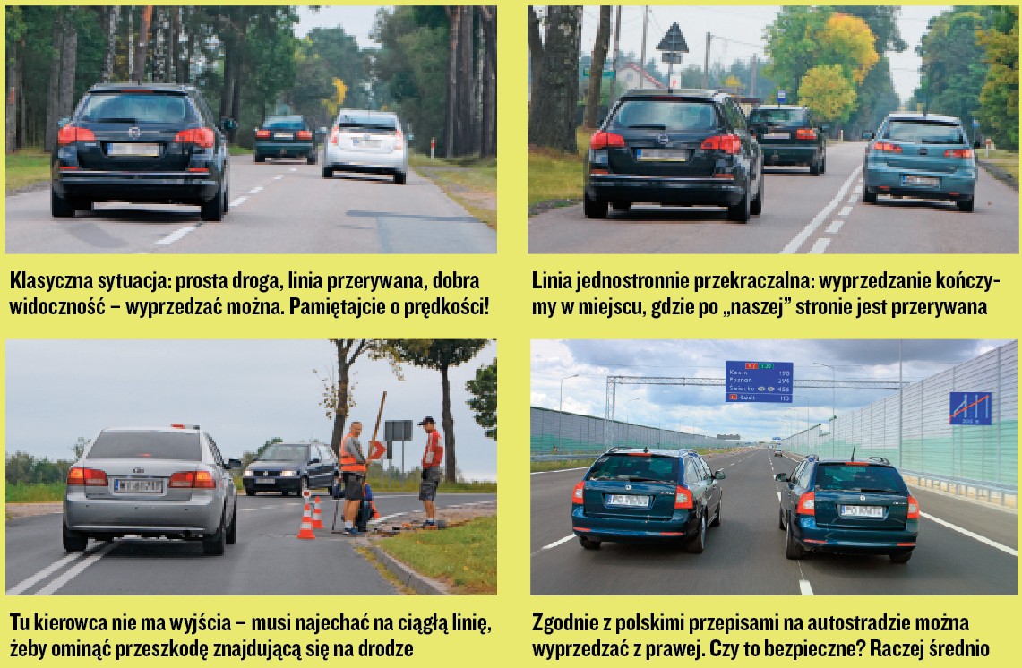 O tym, czy wyprzedzać można, czy nie, decydują przede wszystkim znaki pionowe (zakaz wyprzedzania, odwołanie zakazu) i poziome (podwójna ciągła; poza sytuacją, gdy np. jeden pas jest na tyle szeroki, że – w teorii – zmieszczą się na nim bez najeżdżania na linie dwa pojazdy obok siebie), ale także np. ukształtowanie terenu (nie można wyprzedzać na drodze w czasie dojeżdżania do wzniesienia; nie dotyczy jezdni jednokierunkowej!) oraz przebieg drogi – zakaz wyprzedzania obejmuje m.in. zakręty, skrzyżowania (uwaga: wyjątki to np. tzw. skrzyżowanie kierowane oraz rondo) i przejście dla pieszych (zarówno przed nim, jak i na nim). To zresztą jeden z najczęściej łamanych przepisów, bo np. w miastach często przejścia przecinają ruchliwe drogi z kilkoma pasami.