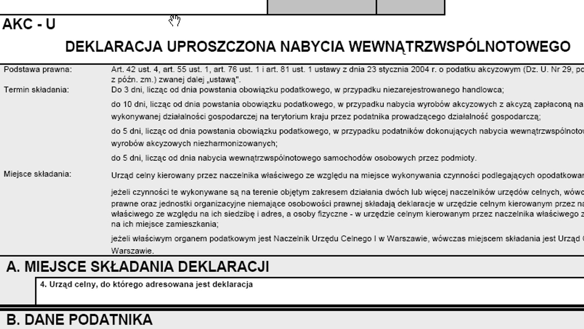 Deklaracja uproszczona nabycia wewnątrz wspólnotowego składanie: do 3 dni, licząc od dnia powstania obowiązku podatkowego, w przypadku niezarejestrowanego handlowcado 10 dni, licząc od dnia powstania obowiązku podatkowego, w przypadku nabycia wyrobów akcyzowych z akcyzą zapłaconą na potrzeby wykonywanej działalności gospodarczej na terytorium kraju przez podatnika prowadzącego działalność gospodarcządo 5 dni, licząc od dnia powstania obowiązku podatkowego, w przypadku podatników dokonujących nabycia wewnątrzwspólnotowego wyrobów akcyzowych niezharmonizowanychdo 5 dni, licząc od dnia nabycia wewnątrzwspólnotowego samochodów osobowych przez podmiotyMiejsce składania: Urząd celny kierowany przez naczelnika właściwego ze względu na miejsce wykonywania czynności podlegających opodatkowaniu;Tu znajdziesz i wydrukujesz Druk uproszczonej deklaracji nabycia wewnątrzwspólnotowego.