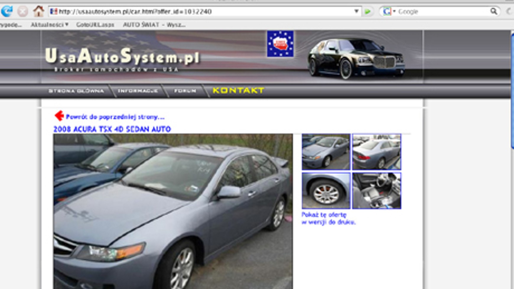 zaczął już naprawiać i zrezygnował z powodu wysokich kosztów. Widzimy samochód z polakierowanym zderzakiem i nie wiemy, że od spodu ma uszkodzoną podłużnicę. Na zdjęciach niewidoczna jest też jakość napraw blacharskich, które w USA bywają przeprowadzane w sposób absolutnie skandaliczny. W USA podejście do aut jest bardzo "wyluzowane".Sprawdźprzeszłość autaW USA istnieją bazy danych o wypadkach, kradzieżach i innych czynnościach związanych z użytkowaniem auta: sprzedażą, rejestrowaniem, odbiorem odszkodowań itp. Za stosunkowo niewielkie pieniądze możemy otrzymać raport o aucie. Zajrzyjmy na strony www.carfax.com lub np. www.autocheck.com. Wpisując VIN samochodu w odpowiednie pole, dowiemy się, czy firma ma ten pojazd w bazie – to jest usługa darmowa. Jeśli ma, dowiemy się jeszcze, jak wiele jest wpisów o „naszym” samochodzie. Następnie za odpowiednią opłatą (np. 30 dolarów) wniesioną za pomocą karty kredytowej otrzymamy kompletny raport o przeszłości danego egzemplarza. Jest to przydatne, bo w USA, jeśli samochód jest wyrejestrowywany z powodu zniszczenia w wypadku, "wylatuje" z baz danych, także z bazy producenta. Nie ma potem możliwości, aby zamówić jakąkolwiek część przez autoryzowaną sieć dilerską. Raport obejmuje także zgłoszenia kradzieży (ich wartość jest oczywista) oraz zgłoszenia szkód komunikacyjnych (można uniknąć kupna samochodu powypadkowego).30 dolarów to najczęściej opłata za dostęp do bazy danych w jednej firmieprzez miesiąc, rzadziej przez dwa miesiące. Warto też pamiętać, że nieuczciwi handlarze wiedzą o działaniu raportów i mogą np. podać nam błędny nr VIN.