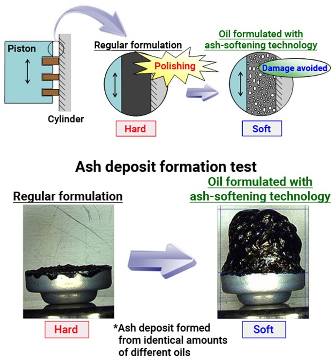 Specjaliści JXTG pracują nad unikatowymi technologiami, które umożliwiają stosowanie jednego rodzaju oleju do cylindrów morskich, nawet na statkach wykorzystujących paliwa o wysokiej i niskiej zawartości siarki. Jednym z takich przykładów jest JAST (technologia zmiękczania popiołu JXTG). Technologia ta stosowana jest w morskich olejach cylindrowych w celu zmiękczania osadów popiołu, które zwykle są dość twarde. Gdy popiół jest miękki, łatwo się kruszy i nie gromadzi się na ruchomych tłokach, co pomaga zapobiegać uszkodzeniom spowodowanym polerowaniem. Technologia JXTG okazała się skuteczna przy zastosowaniu w rzeczywistych silnikach. Wykazano, że dzięki niej tłoki pozostają czyste podczas długotrwałej pracy.