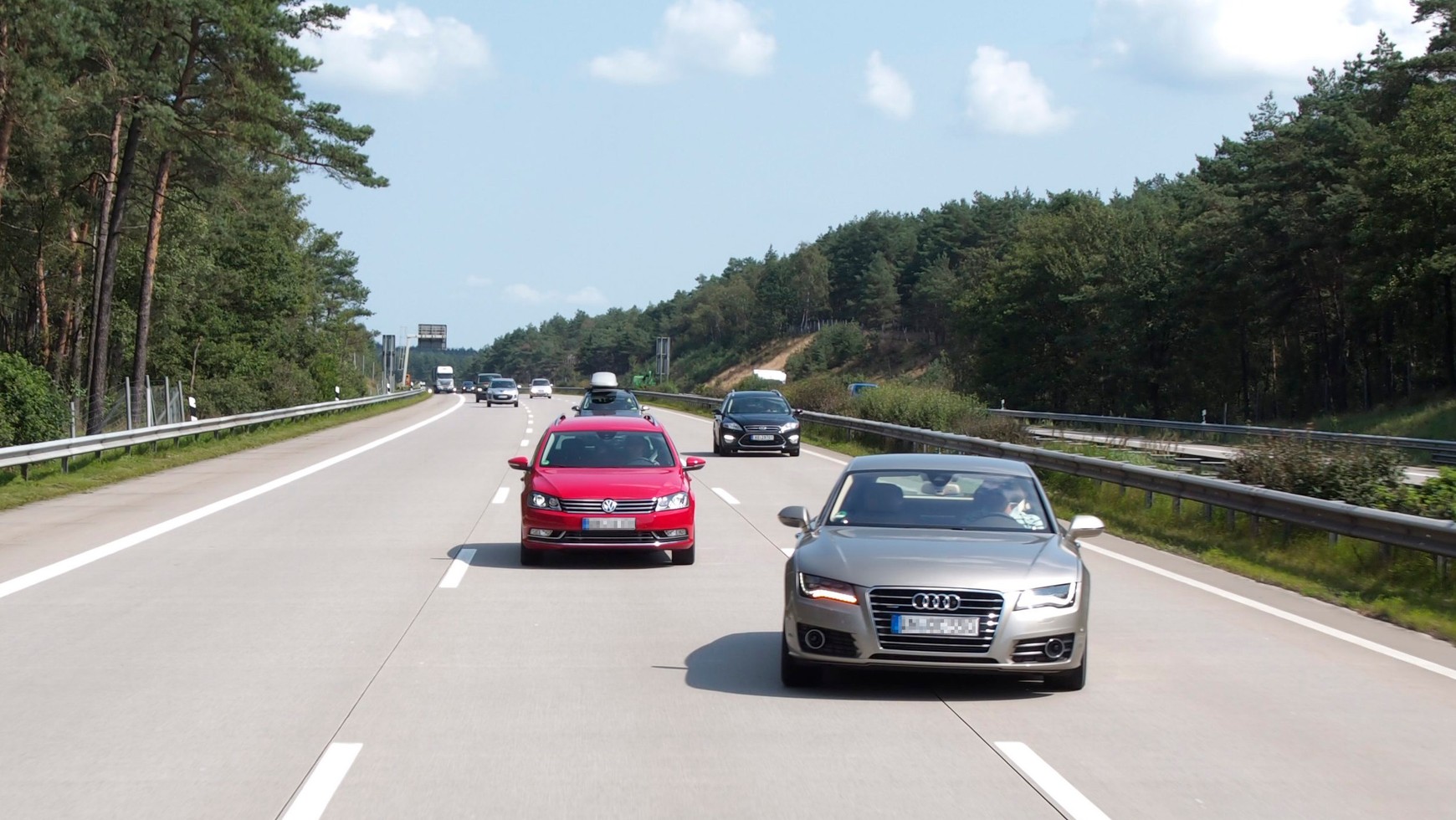 Środkowym pasem jedzie z przodu grupa wolniej jadących samochodów, zmieniam więc pas na lewy, żeby je wyprzedzić. Przede mną lewym pasem jedzie inny samochód. Różnice prędkości są niewielkie, niewiele się więc dzieje, spokojna, bezpieczna jazda.