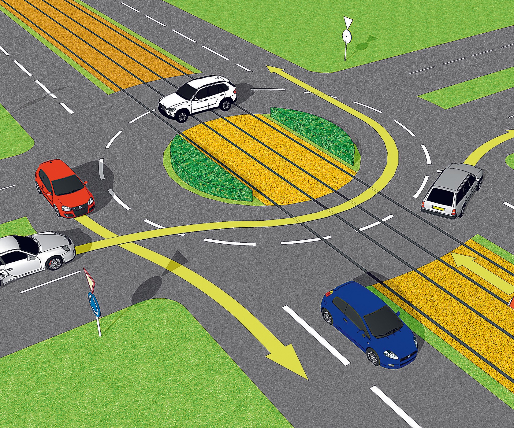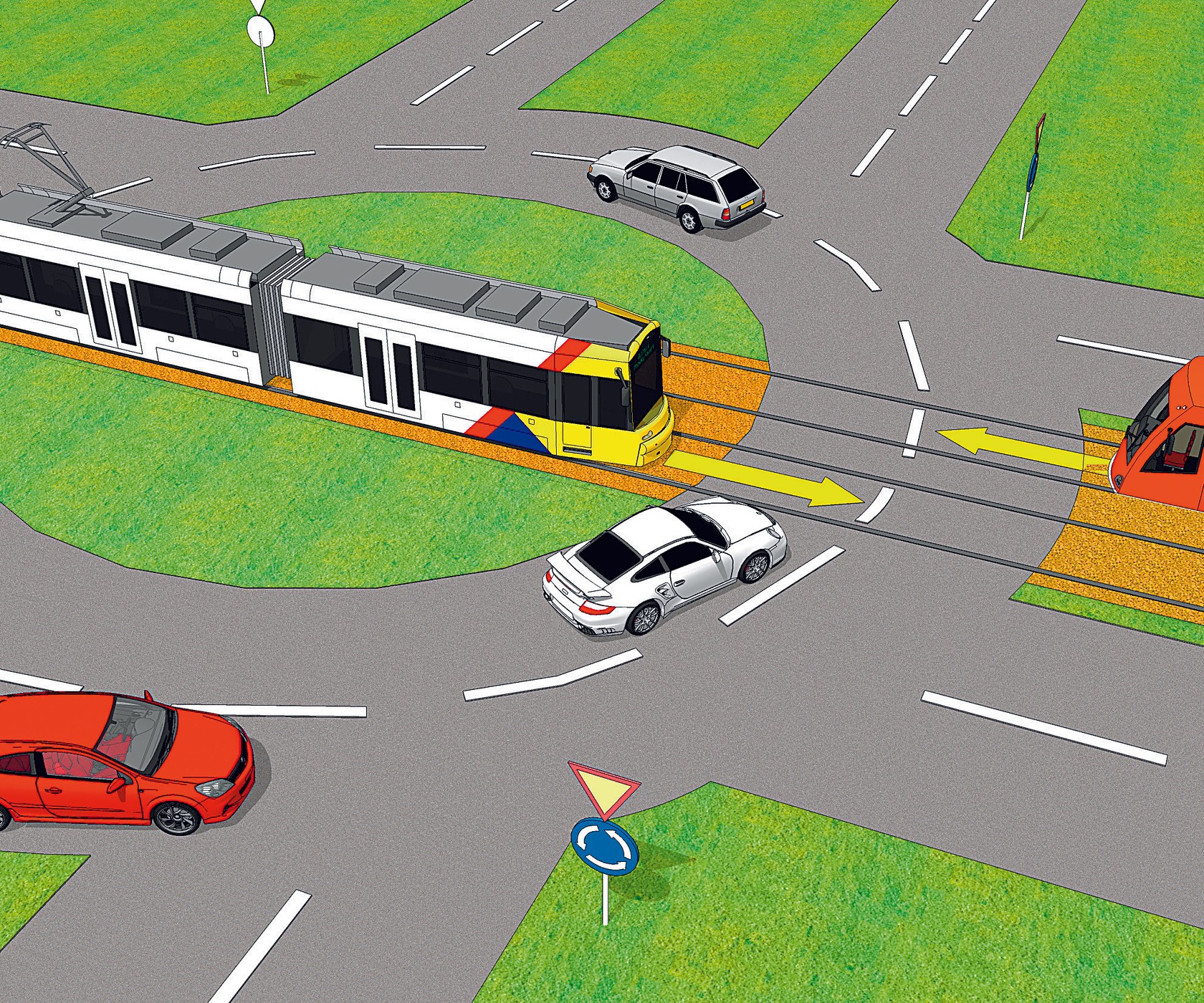 Na rondzie oznakowanym znakami C-12 i A-7 pojazdy znajdujące się na rondzie mają pierwszeństwo przed pojazdami wjeżdżającymi na rondo. Tramwaj musi stosować się do znaków drogowych "ustąp pierwszeństwa"