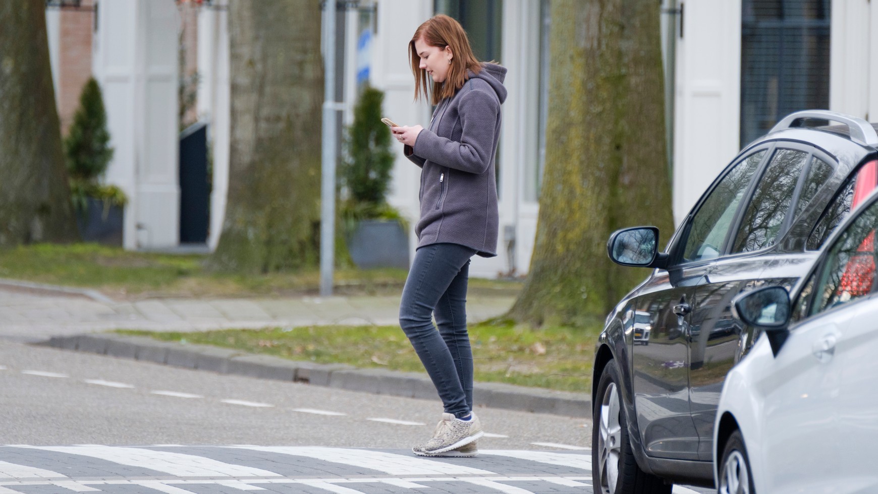 Pieszy ze smartfonem na przejściu przez jezdnię