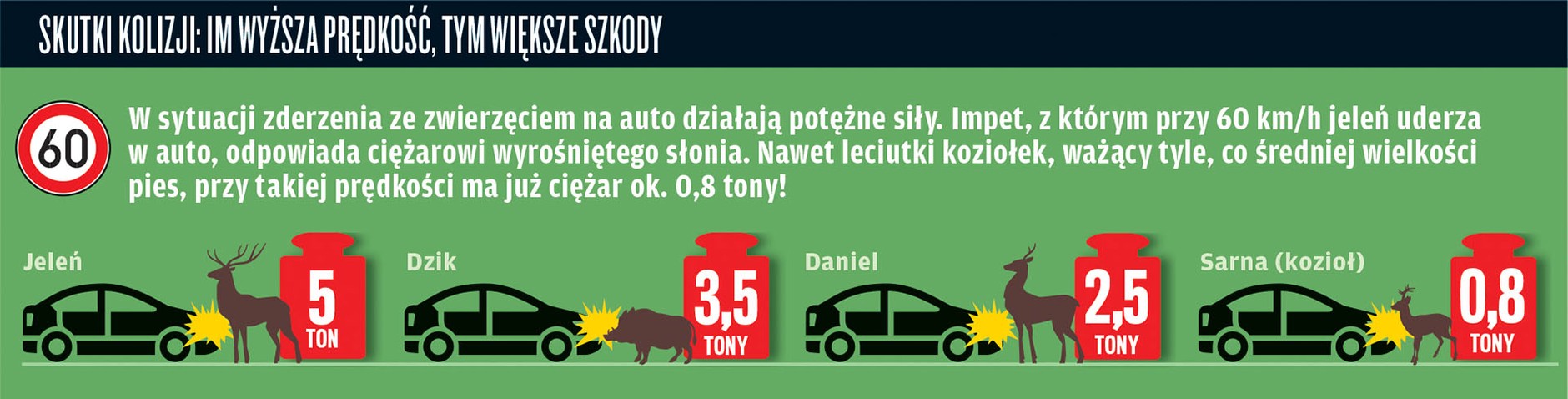Warto sobie uświadomić, że przy prędkości 100 km/h przeciętny kierowca jadący sprawnym autem potrzebuje niemal 80 metrów na zatrzymanie pojazdu. Na ten dystans składają się droga hamowania i czas reakcji. Jeśli zwierzę na drodze zobaczycie z odległości 60 m, co przy jesiennej szarudze i tak jest optymistycznym założeniem, to jeśli nie zdąży ono przed autem uciec, uderzycie w nie z prędkością ok. 60 km/h! Z 80 km/h da się zahamować „na styk”. Noga z gazu!