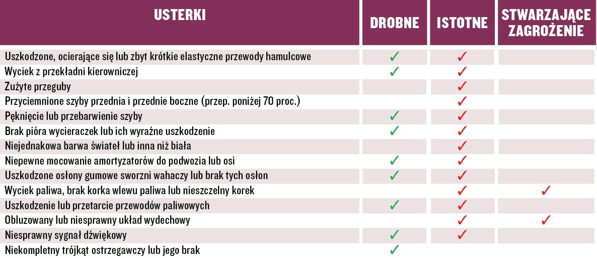 Przepisy dzielą usterki na drobne, istotne i zagrażające bezpieczeństwu, a diagnoście w wielu przypadkach pozwalają na ocenę, do której kategorii je zakwalifikować. Oznacza to, że niezaliczenie badania z powodu niezbyt istotnej usterki jest mało prawdopodobne. Kategoryzację wprowadzono właśnie po to, żeby uniknąć takich sytuacji.