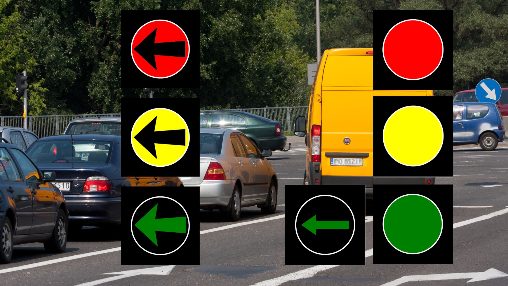 Znaczenie sygnalizatorów kierunkowych myli się kierowcom. Na jednym strzałka jest odseparowana – pojawia się na osobnym wyświetlaczu i może być skierowana w lewo albo w prawo, na drugim strzałka znajduje się na każdym z głównych wyświetlaczy i może być skierowana w dowolnym kierunku – w prawo, w lewo na wprost, a nawet do dołu. Dozwolone są też kombinacje różnych kierunków.
