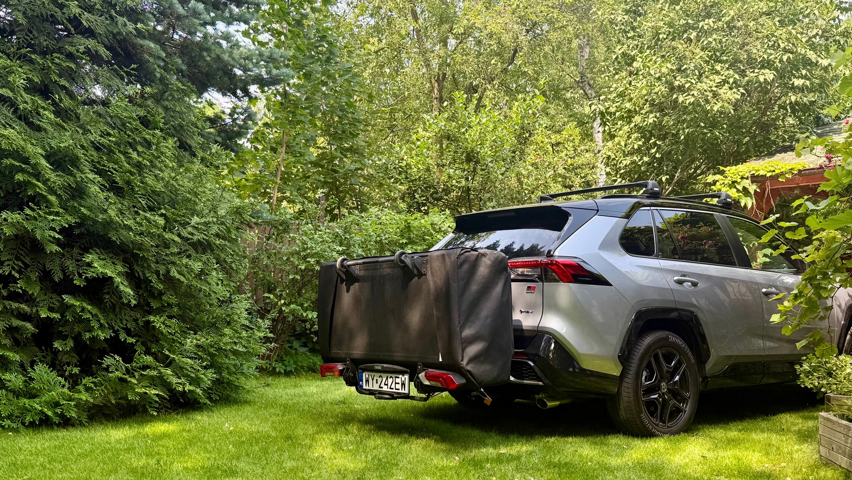 Namiot na hak szwedzkiej marki (ciekawostka: jest produkowany w Polsce) to skrzynka większa niż się wydaje. I cięższa niż się wydaje. Jeśli mieszkasz w bloku i miałbyś go nosić choć przez pół piętra... zapomnij, to waży 70 kg. Jeżeli masz garaż – to OK – sprzęt ma kółka pozwalające przetaczać go z miejsca na miejsce i jest zaprojektowany tak, by można było go umieścić na haku holowniczym jednoosobowo. Nie jest to może zadanie dla filigranowego zawodnika o wątłej sile fizycznej, ale się da. Skrzynka ma też funkcję odchylania – gdy jest już zamontowana na haku – aby nie blokować dostępu do bagażnika samochodu.