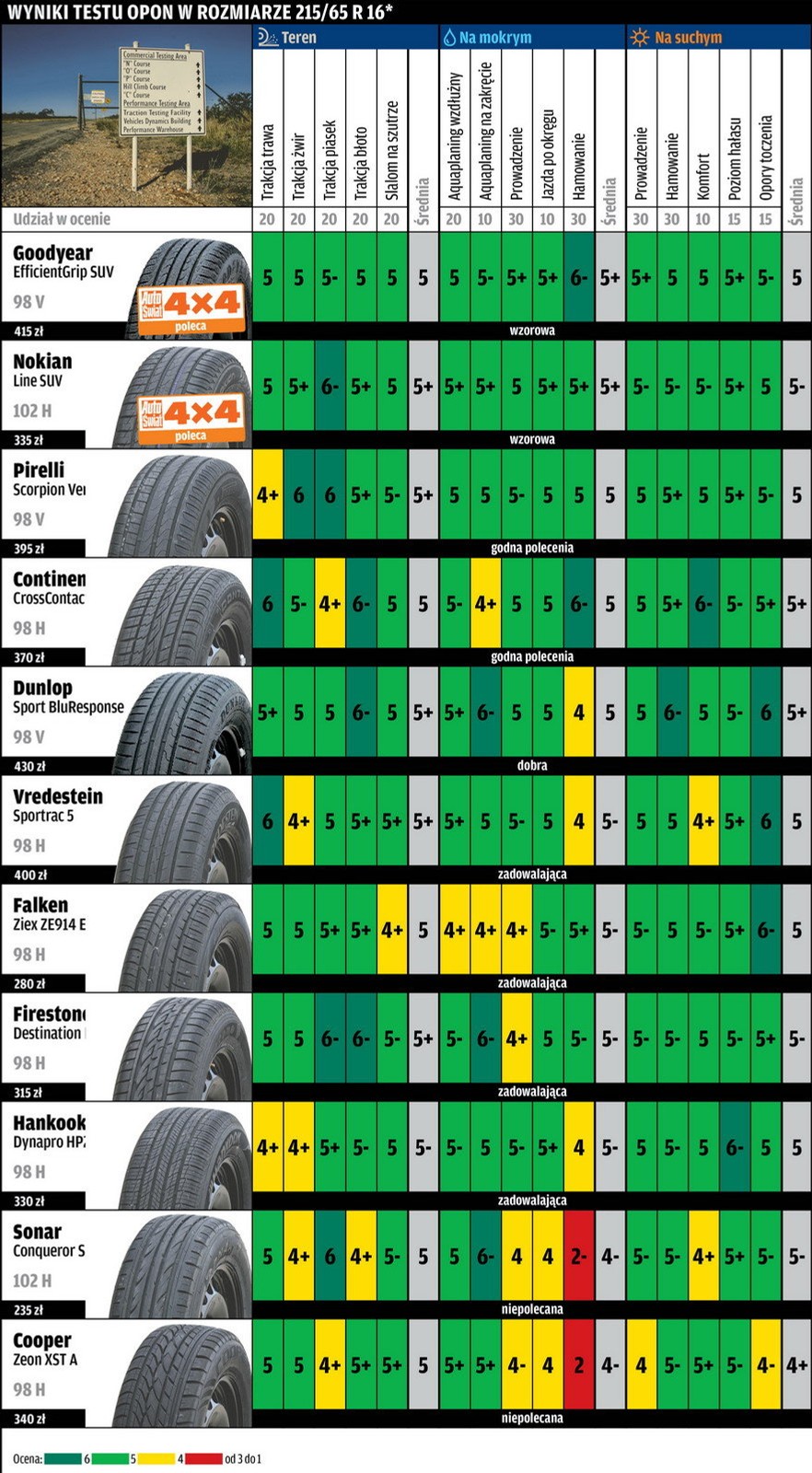 W przypadku takiej samej liczby punktów producenci zostali podani w kolejności alfabetycznej. Każda ocena z kategorii: teren, mokra i sucha nawierzchnia stanowi 1/3 oceny ogólnej.