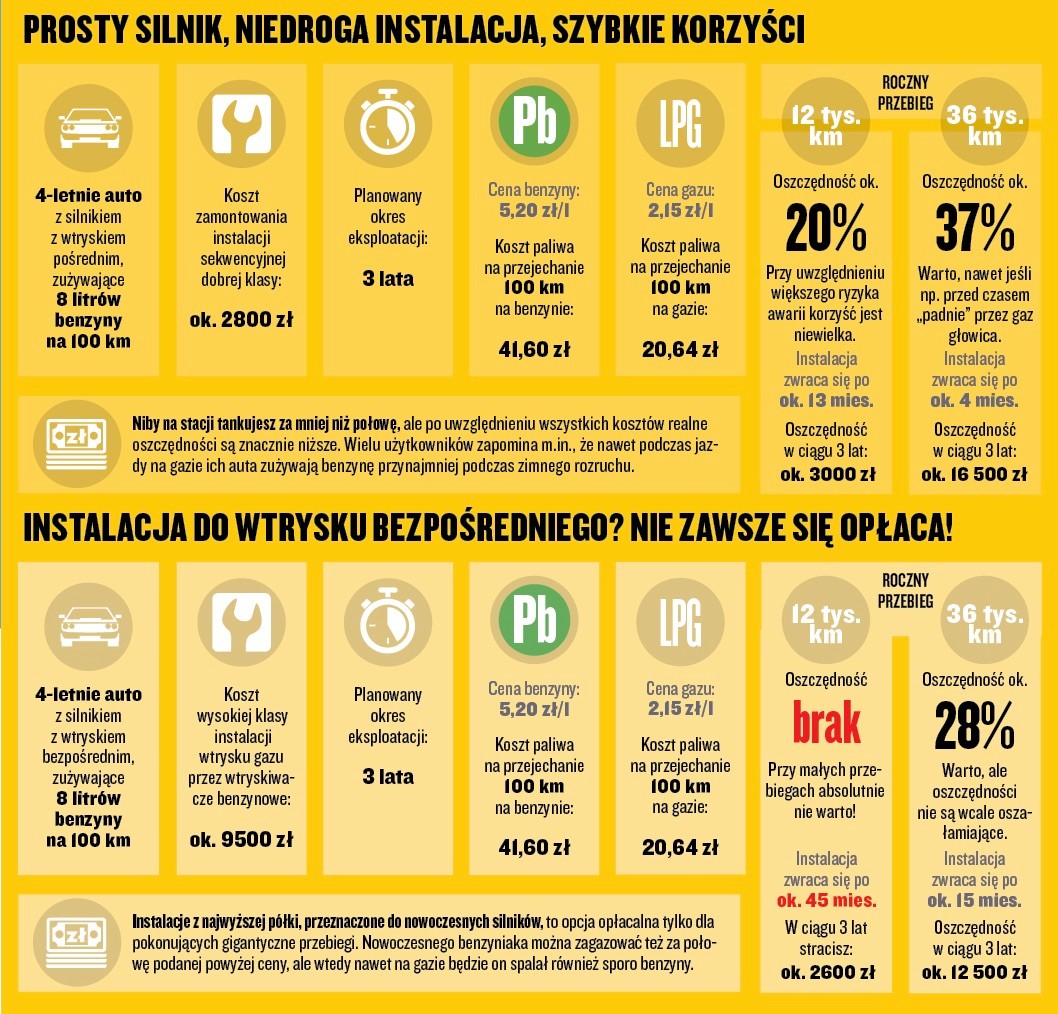 Do tego dochodzą większe koszty serwisowania auta, potencjalnie wyższa awaryjność i niższa trwałość niektórych podzespołów, m.in. głowicy silnika czy katalizatora. Im wyższe przebiegi roczne auta, tym szybciej instalacja się zwróci i tym szybciej można zacząć oszczędzać. Realne oszczędności bardzo rzadko przekraczają 35-40 proc.