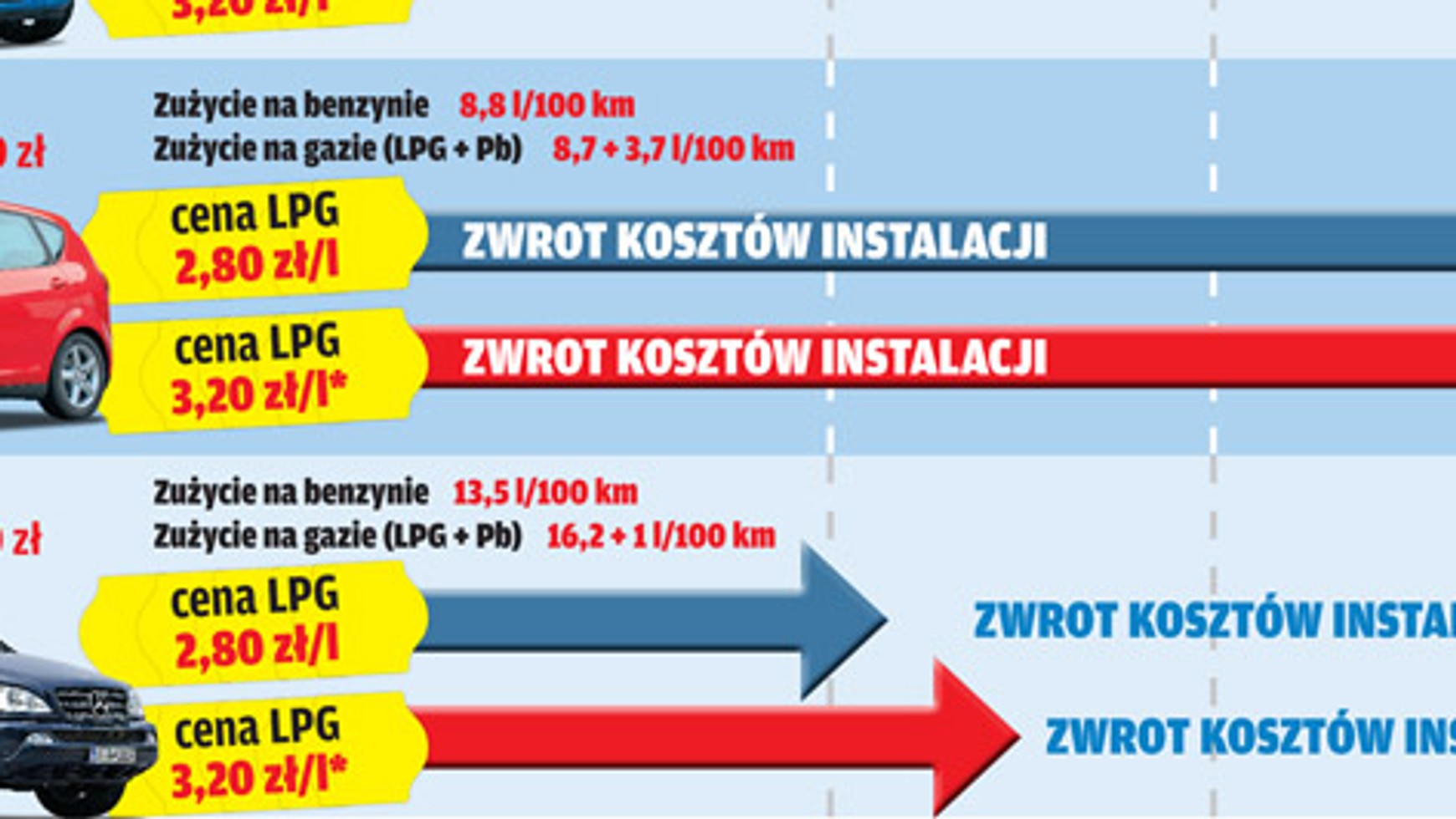 Problem w tym, że osoby, które planują taką inwestycję, najczęściej całą kalkulację ograniczają do porównania wydatków na paliwo, a pomijają czas zwrotu samej instalacji i większość dodatkowych kosztów wynikających z jej zastosowania. Niestety, oszacowanie wydatków na gaz też zazwyczaj jest bardzo wyidealizowane – zakłada się optymistycznie, że auto spali tylko o 10-15 procent więcej niż na benzynie, i nie uwzględnia się faktu, że silnik pracujący na gazie też zużywa benzynę.