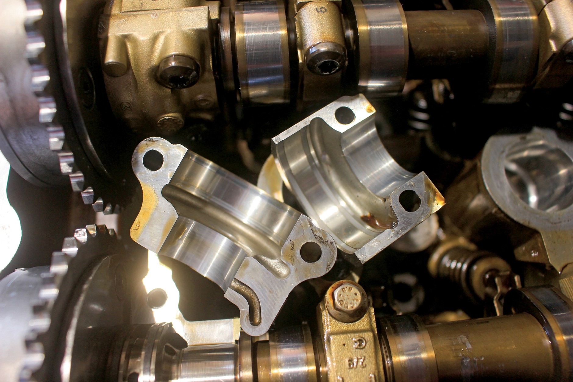 Objawy: półpanewki umieszczone na wałkach od strony łańcucha rozrządu odpowiadają nie tylko za smarowanie, lecz także za sterowanie zmianą faz rozrządu – uszkodzenie powoduje utratę ciśnienia oleju oraz problemy z regulacją faz rozrządu.