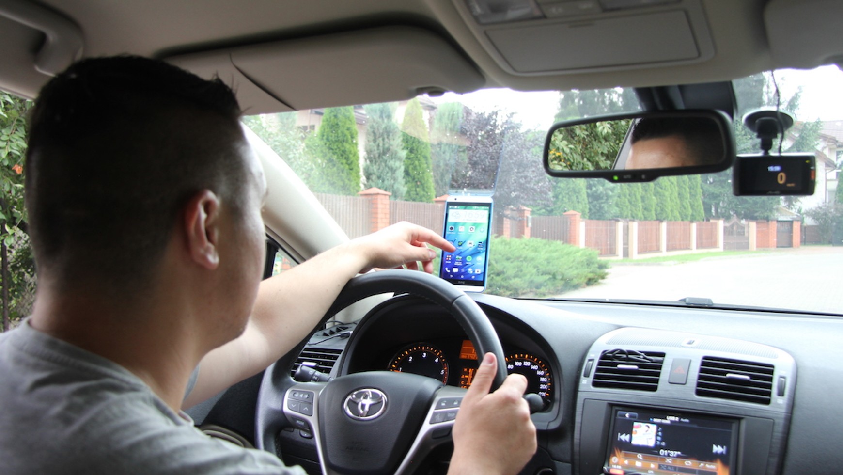 2. Smartfon pozostawiony na konsoli centralnej i oparty o wyświetlacz auta. Przy mocniejszym przyspieszeniu wyląduje na podłodze. Niewykluczone, że uderzy też w gałkę dźwigni zmiany biegów.