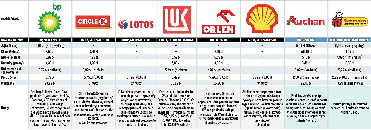 W przypadku większości stacji i sklepów udało się znaleźć identyczne produkty (np. podstawowy chleb, masło Łaciate, wódka 0,5 l Wyborowa, piwo Żywiec but. 0,5 l) – tam, gdzie danej rzeczy nie było, zaznaczamy, że chodzi o inną lub o większe/mniejsze opakowanie. W przypadku koncernów, które udostępniły nam dane, podajemy też liczbę placówek działających na terenie całego kraju.