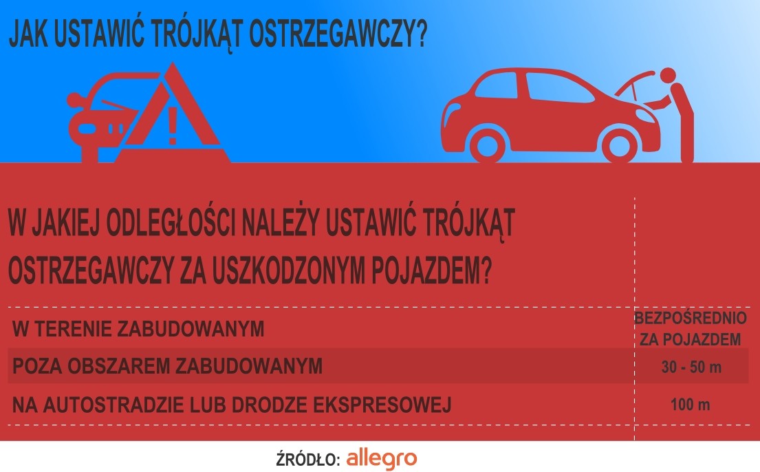 - Na obszarze zabudowanym trójkąt ostrzegawczy powinien się znajdować nie więcej niż metr od unieruchomionego pojazdu, poza obszarem zabudowanym musi znajdować się w odległości od 30 do 50 metrów, a na autostradzie lub drodze ekspresowej odległość od auta powinna wynosić 100 metrów – dodaje Ciesielski – Warto pamiętać, że za nieużycie trójkąta ostrzegawczego policja może nałożyć mandat karny w wysokości 150 zł, natomiast za jego brak wiąże się z grzywną w wysokości od 20 do 500 zł.