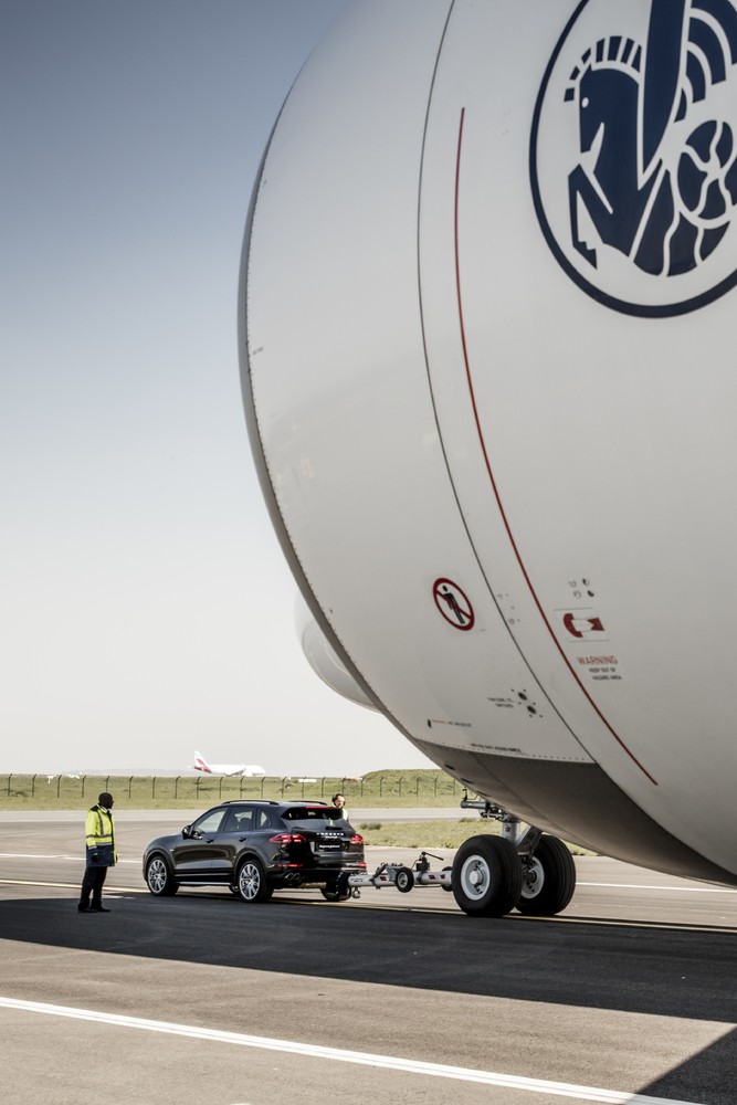 Próba przeciągnięcia ważącego 285 t samolotu miała miejsce na lotnisku Charles de Gaulle pod Paryżem. Do standardowego haka w mierzącym 4,8 m Cayenne S Diesel podpięty został zaczep holowniczy, na którego drugim końcu znalazł się samolot o długości 73 m. Payne wykorzystał pełen potencjał silnika V8 z jego 850 Nm maksymalnego momentu obrotowego, by po kilku chwilach dotrzeć do mety holując za sobą kolosa. Następnie powtórzył ten sam manewr używając Cayenne Turbo S, który ma nieco mniejszy moment obrotowy.