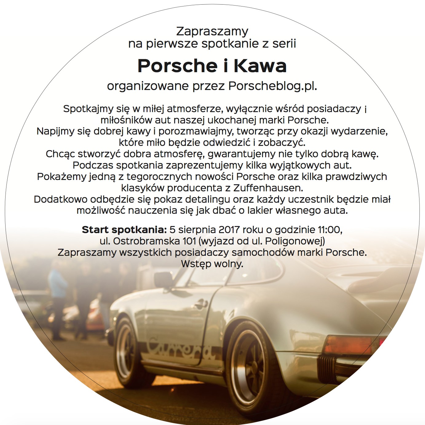 Zapraszamy 5 sieprnia na Porsche i Kawa. Widzimy się na ul. Ostrobramskiej 101 – wjazd od ul. Poligonowej. Już teraz zapiszcie datę w kalendarzu oraz dołączcie do wydarzenia na Facebooku! Porsche, kawa i weekend to musi być dobre połączenie. Zaprasza Porscheblog.pl - strona dla miłośników marki.