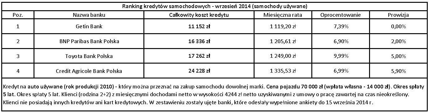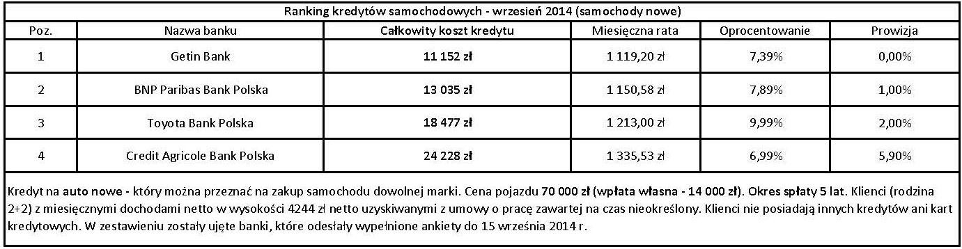 Klienci nie posiadają innych kredytów, ani kart kredytowych i chcą kupić nowe lub używane auto o wartości 70 000 zł. Ze względu na posiadane przez naszych klientów środki własne, wysokość zaplanowanego na okres 5 lat kredytowania wynosić ma 56 000 zł. W zestawieniu ujęte zostały oferty czterech banków, którzy odesłali wypełnione ankiety do 15 września 2014 r.