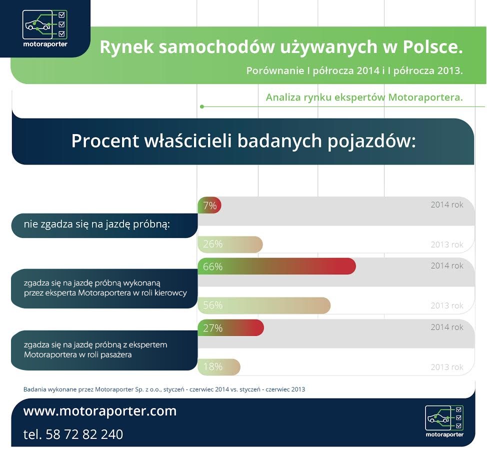 Faktem jest, że w I półroczu 2014 roku mniej niż 1 na 10 sprzedawców nie zgodził się w ogóle na jazdę próbną eksperta Motoraportera – jest to pozytywna zmiana względem I półrocza 2013 roku. Zmniejszenie się odsetku sprzedających nie zgadzających się na jazdę próbną jest związane ze zwiększającą się ilością właścicieli nie zgadzających się w ogóle na oględziny eksperta Motoraportera.