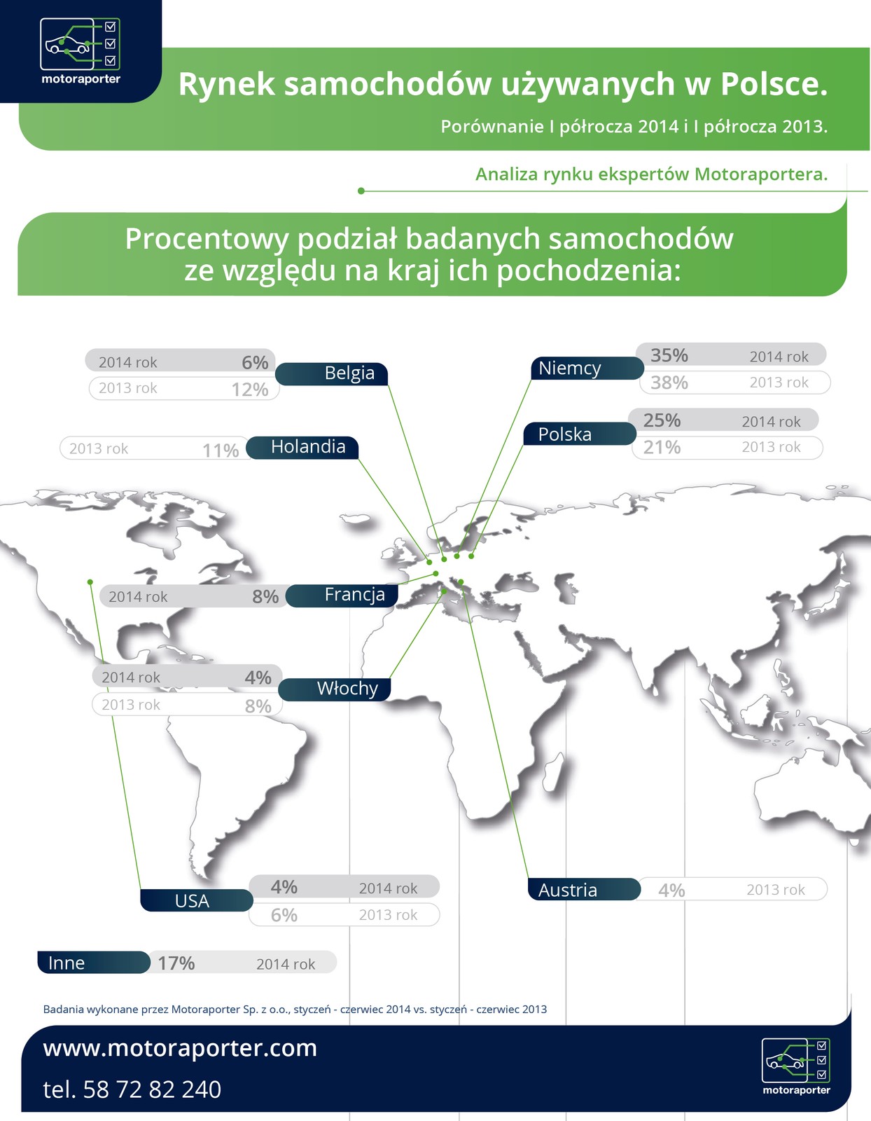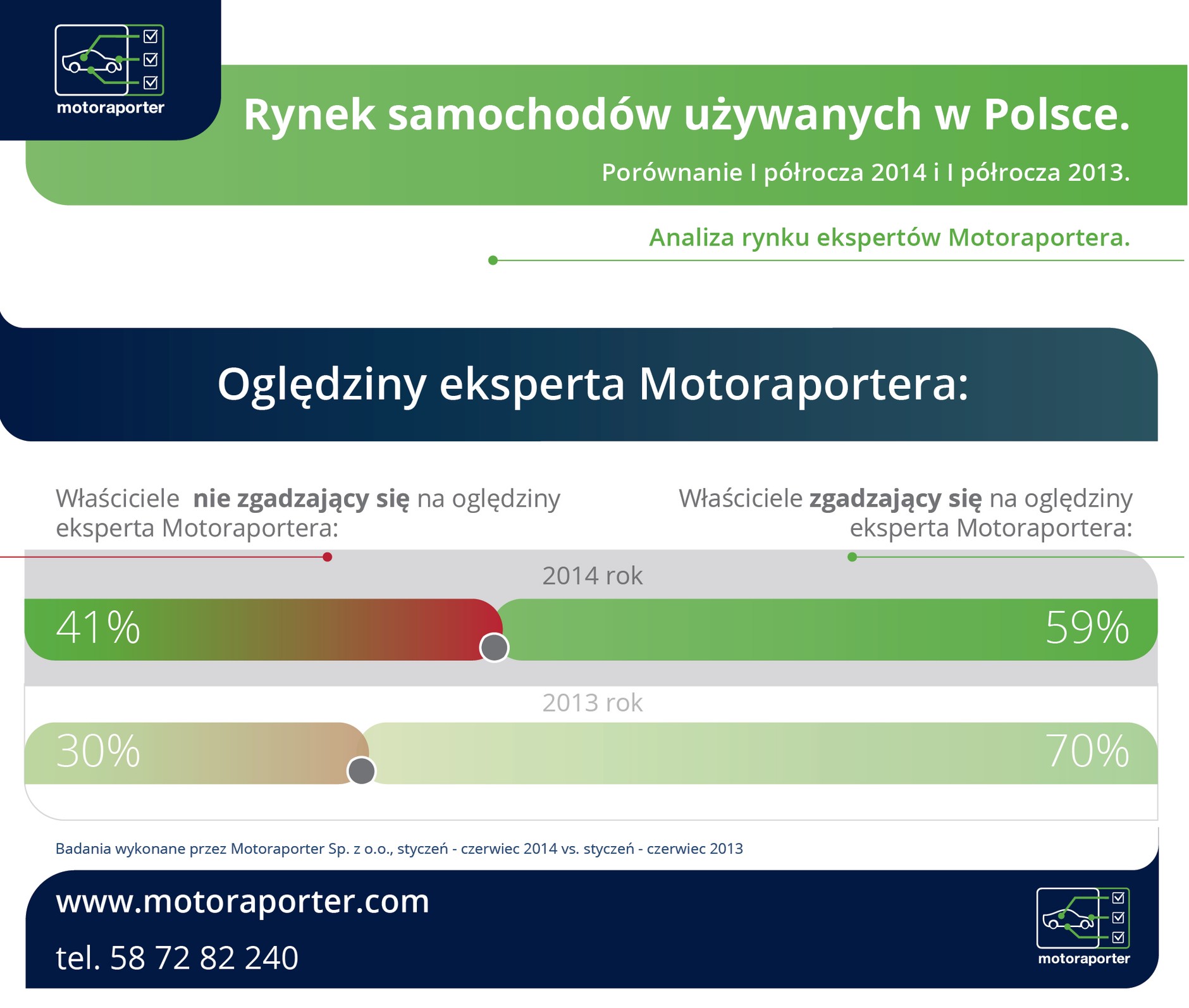 Motoraporter na bazie tysięcy wykonanych w I półroczu 2014 roku inspekcji pojazdów wykonywanych na zlecenie swoich klientów publikuje raporty dotyczące rynku samochodów używanych. Efektem naszej pracy jest zestawienie informacji z ogłoszenia ze stanem faktycznym pojazdów które sprawdzają nasi eksperci – mówi Marcin Ostrowski Prezes Zarządu Motoraportera.