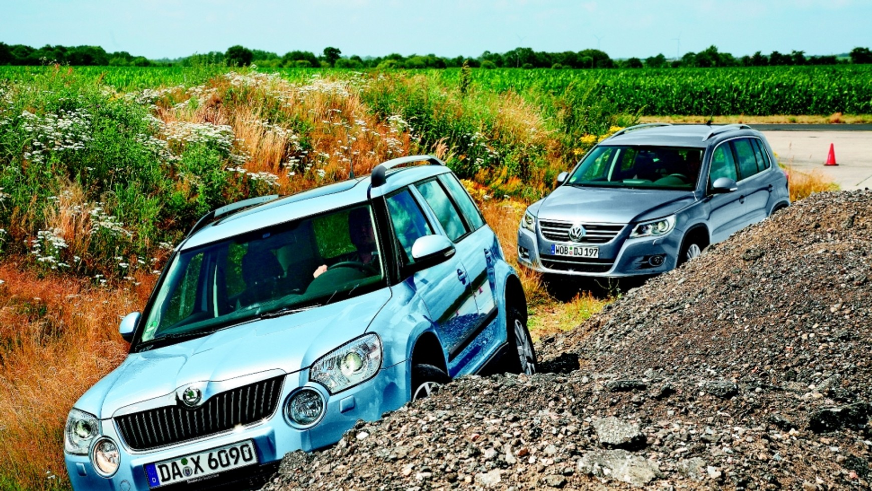 Większy wydatek poniesiony przy zakupie Tiguana okazuje się dobrą inwestycją podczas ciężkich prób drogowych. VW może ciągnąć nawet o 600 kg cięższą przyczepę niż Skoda. Ma za to nieco gorszą ładowność.Który SUV okaże się lepszym wyborem, jeśli chodzi o jazdę po bezdrożach? Tutaj różnice są nieznaczne, a reprezentowany poziom ogólnie rzecz biorąc – mało imponujący. Auta poradzą sobie tylko na w miarę płaskim terenie. Pomiędzy osiami w obydwu przypadkach pracuje sprzęgło typu Haldex. Tiguan ma nieco lepszy prześwit oraz większy skok kół, a za dopłatą można go wyposażyć w kilka detali przydatnych w terenie: lepiej „podcięty” przedni zderzak (wersja Track&Field) i system Off-Road, wspomagający kierowcę, by ten nie spalił sprzęgła wjeżdżając pod strome zbocza. Yeti również ma taki układ, który działa zarówno na podjazdach, jak i zjazdach (wiele prędkośći zjazdu). W Skodzie warto zamówić dodatkowe osłony podwozia (nawet tylnej ramy pomocniczej).