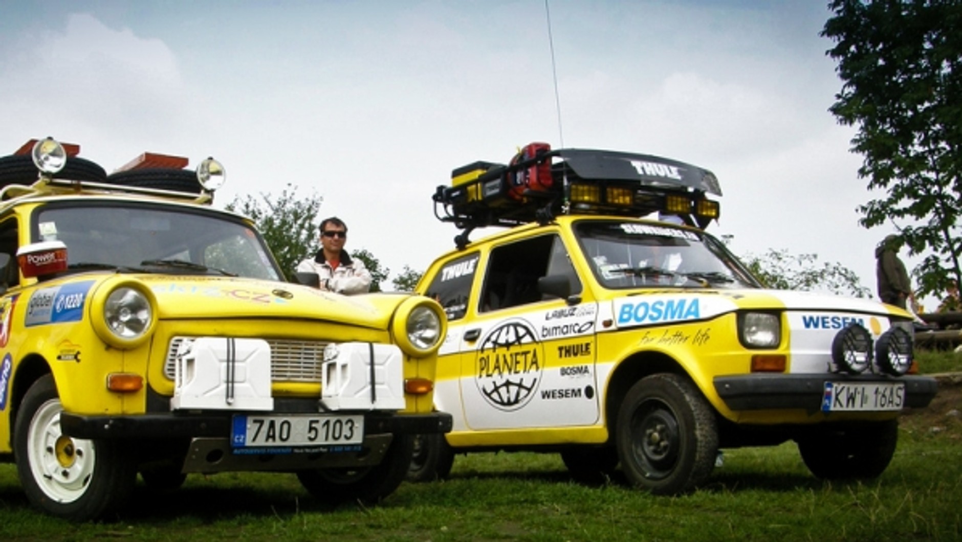 Maluch zapakowany. Wyruszamy o 4 nad ranem. Nie spaliśmy. Start na praskim wyszechradzie przewidziany jest na 12. Nie ma czasu. Grzejemy na Cieszyn, ale natury nie da się pokonać. W Andrychownie musimy zrobić drzemkę na jakiejś stacji benzynowej. Przed świtem budzą nas chłopaki i dziewczyny z piwami za pazucha. Wracają z imprezy, ale mają ochotę jechać jeszcze na grzyby. Są wyraźnie zainspirowani Maluchem. Pytają gdzie jedziemy tym sprzętem. Odpowiadamy ze do Brazylii... Rozlega się salwa śmiechu... Ale na seriooo?... No to mówimy na serio że do Brazylii... Zrobiło się wesoło, rozbudziliśmy się, wiec heja na Żywiec (nie na żywca...). Przed Cieszynem powtórka z rozrywki. Komora silnika zarzygana olejem. Uszczelka się rozwarstwiła od... zbyt mocnego dokręcenia. Tym razem dokręcamy dekiel bardzo precyzyjnie, nie za mocno, nie za słabo... Wycieramy zabryzganą komorę silnika, robimy dolewkę z oleju, przy okazji dociągamy lekko śruby kolanka wydechu. Silnik jest na dotarciu i cos musiało popuścić. Z czystymi rękoma na start w Pradze to wstyd. O 7.00 rano wita nas Czeska Republika!!! Dojeżdżamy do autostrady... Mamy "spinę" by tym razem historia się nie powtórzyła. Pierwsze podliczenie spalania. 6,7L... Trochę sporo jak na Malucha. Mamy na górze sporo bagażu, jesteśmy doładowani i ciśniemy 90 100km/h. Na 200 km przed Pragą robimy jeszcze jedną, godzinną drzemkę. Kilometry lecą jeden za drugim, czeski bigbit w radio, wkrótce lądujemy na wyszechradzie. Witają nas setki osób. Parkujemy obok Trabantów i co nas w pewnym sensie cieszy, - nie jesteśmy ostatni. Brakuje jeszcze Jawy.Po godzinie przyjeżdża Marek wraz z Jawą 21, Pionyr, 50ccm, żółte zło w czystej postaci. Robią nam wszystkim sesje zdjęciowa, materiał TV do wieczornej edycji czeskich wiadomości i startujemy...