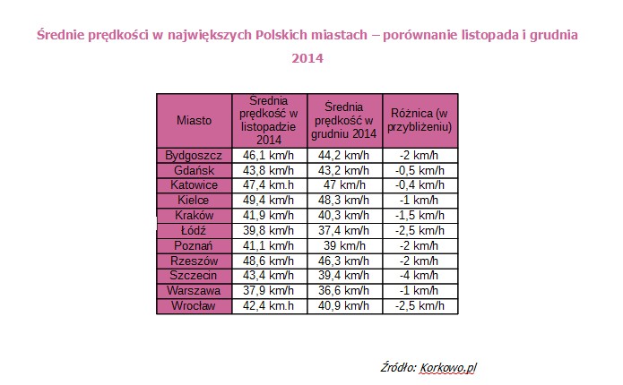 Wyniki badania przeprowadzanego przez portal Korkowo.pl wskazują jasno, że wszystkie miasta zwalniają w okresie przedświątecznym. W badaniu porównano średnie prędkości z listopada z jedenastu największych polskich miast ze średnimi prędkościami w tych samych miejscach w grudniu 2014. Notowane spadki w ostatnich dniach wynoszą od 0.5 km/h do nawet 4 km/h.