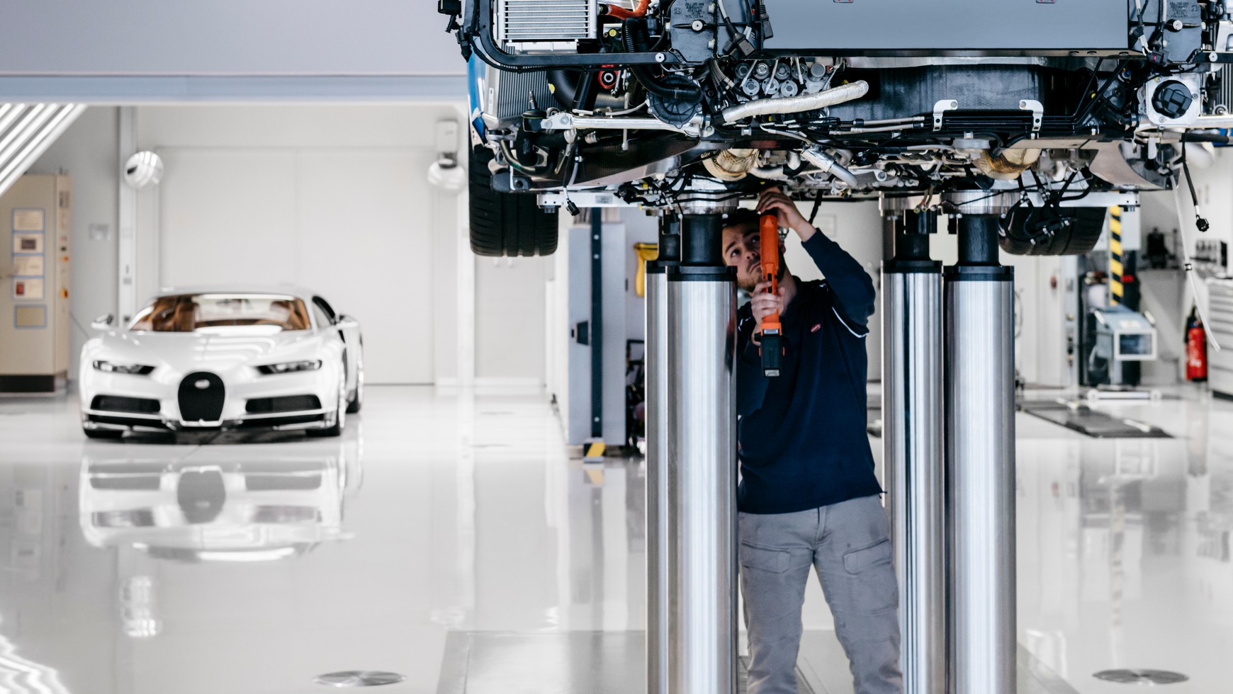 Manufaktura Bugatti zlokalizowana jest w miejscowości Molsheim w Alzacji, która jest siedzibą firmy od momentu jej założenia w 1909 r. Atelier mieści się w owalnym budynku zaprojektowanym na wzór logo marki, a jego centralną część stanowi hala o powierzchni 1000 m kw., w której do niedawna powstawały Bugatti Veyron. Przed rozpoczęciem produkcji nowego modelu podłoga warsztatu została wykończona białą żywicą epoksydową, która przewodzi prąd, by rozpraszać ładunki elektryczne. Efekt przypomina laboratorium chemiczne, na szczęście pracownicy nie muszą zakładać specjalnych kombinezonów i masek.