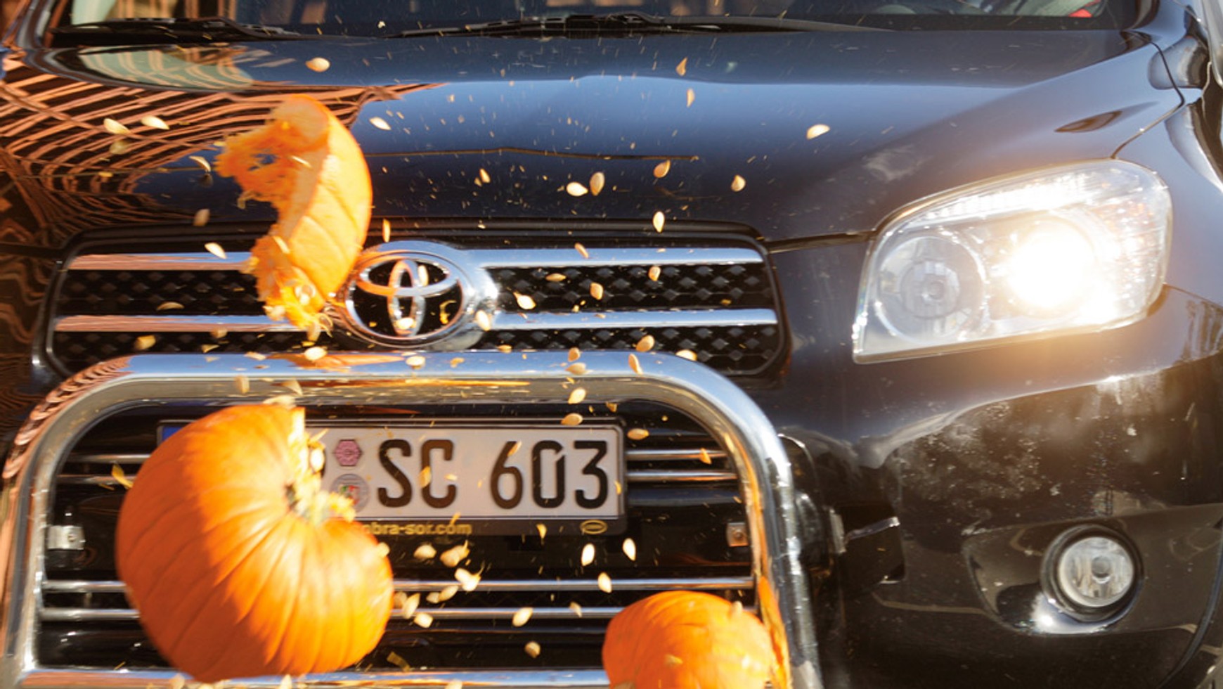 Wyruszamy. Droga prowadzi nas do firmy zajmującej się produkcją akcesoriów rurowych do SUV-ów i lekkich terenówek. W służbowym dostawczaku upchnęliśmy różnorakie przedmioty, które będą musiały stawić czoła uzbrojonej „po zęby” Toyocie. Wśród nich są: drewniany płotek ogrodowy, pojemnik na śmieci, rower górski, wózek na zakupy, pluszowy miś oraz dynia. Ciekawe, czy choć jedna z tych rzeczy przetrwa bliskie spotkanie z japońskim autem?