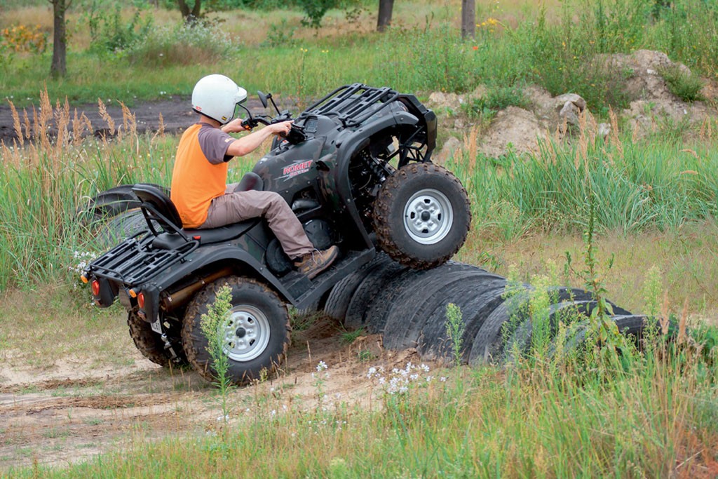 Warto podkreślić, że w terenie wielokrotnie spędziliśmy kilka godzin. Quad ani razu nie zawiódł. Zawsze bez kłopotu zapalał, hamulce (tarcze przy kołach przednich, z tyłu centralna na wale napędowym) były odporne na zabrudzenie i cały czas działały poprawnie. Jedyny mankament to słabej jakości farba, którą pokryto wewnętrzną stronę błotników. Po oczyszczeniu Rometa ciśnieniową myjką (inaczej się nie da!) pojawiły się tam spore powierzchnie… białego tworzywa sztucznego. Na szczęście podczas jazdy są one niewidoczne, na górze lakier trzyma się świetnie.