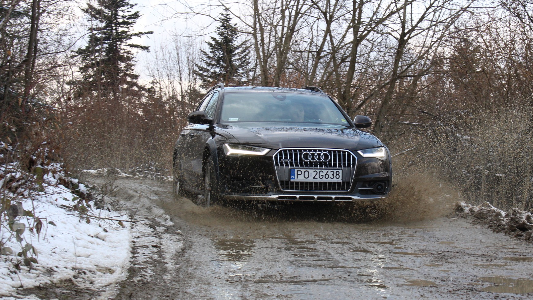 Audi A6 Allroad otrzymało zestaw osłon chroniących nie tylko karoserię, ale i podwozie. To dobrze, bo trochę szkoda byłoby, gdyby podczas przejażdżki podmokłą leśną drogą do komory silnika dostało się błoto. Allroad może się też pochwalić całkiem niezłym kątami rampowym oraz natarcia i zapewne poradziłoby sobie w trudniejszych warunkach, ale nie mieliśmy odwagi tego sprawdzić.