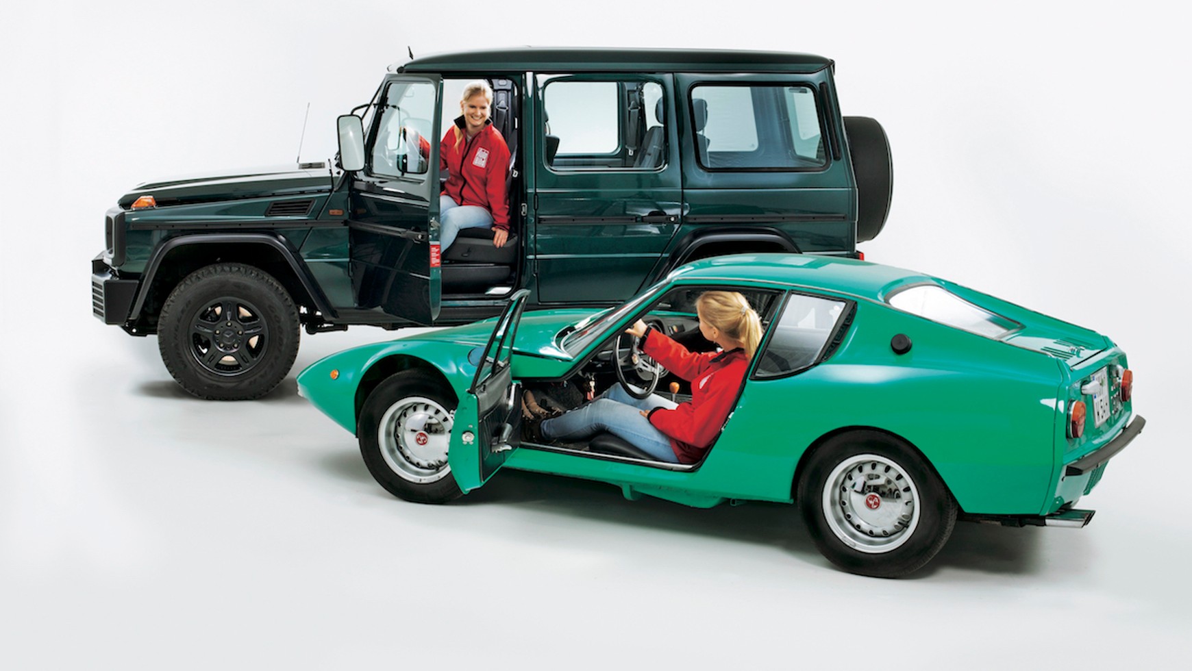 Z perspektywy kierowcy sportowego oldtimera (Abarth Scorpione, 350 mm) prowadzący Mercedesa klasy G (910 mm) znajduje się dwa piętra wyżej.