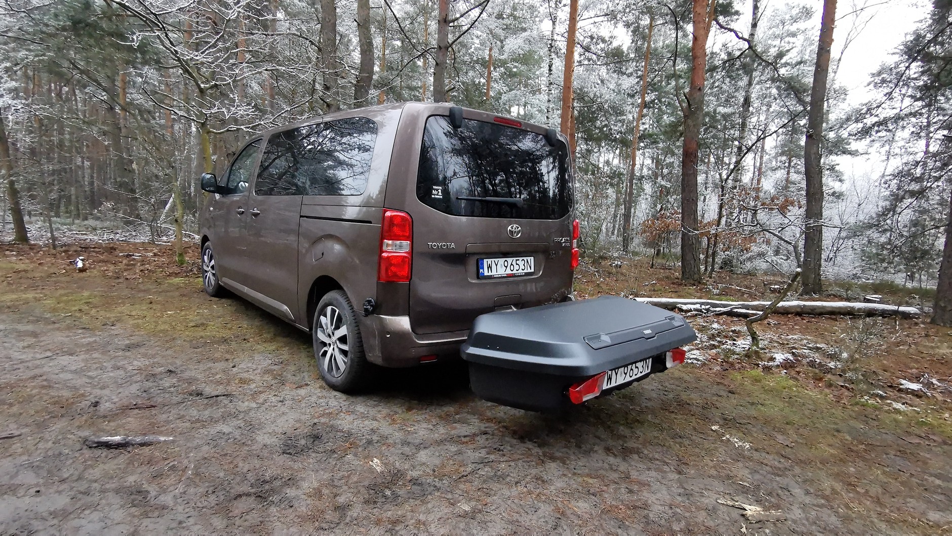 Z montażem nie ma wiele pracy, ale jednak trochę jest. Trzeba połączyć bazę (dyszel) z kufrem, zamontować bębenki zamków. Przy okazji wychodzi na jaw jedna z większych zalet tego rozwiązania nad klasycznymi boksami bagażowymi przeznaczonymi do montażu na dachu samochodu: można to ogarnąć jednoosobowo. Za pierwszym razem cała operacja – rozpakowanie części, czytanie instrukcji obsługi, instalacja (trzeciej) tablicy rejestracyjnej i montaż na haku holowniczym zajmuje godzinę. Potem każdorazowe odpięcie kufra od samochodu trwa minutę, montaż pewnie ze dwie minuty. Aby zamontować na aucie kufer dachowy, trzeba najpierw mieć założony bagażnik bazowy (czyli belki), a następnie konieczna jest pomoc drugiej osoby. Nawet jeśli kufer dachowy nie jest przesadnie ciężki, to jedna osoba nie jest w stanie go chwycić i umieścić na dachu.