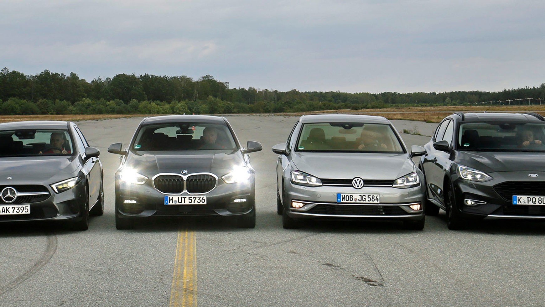 W pierwszym porównaniu zestawiamy nową serię 1 z mocnymi rywalami: Fordem Focusem, Mercedesem klasy A i VW Golfem. Wszystkie są napędzane przez dwulitrowe diesle o mocy 150 KM, ale różnią się skrzyniami biegów. BMW ma klasyczny „automat” z 8 przełożeniami. Mercedes też ma 8 biegów, ale przekładnię dwusprzęgłową. DSG Volkswagena z kolei ma o jeden bieg mniej, a Focus jako jedyny występuje z 6-stopniową skrzynią manualną – niestety, Ford nie był w stanie dostarczyć innego egzemplarza, w dodatku jest to wersja Active z podniesionym zawieszeniem i crossoverową stylistyką karoserii.