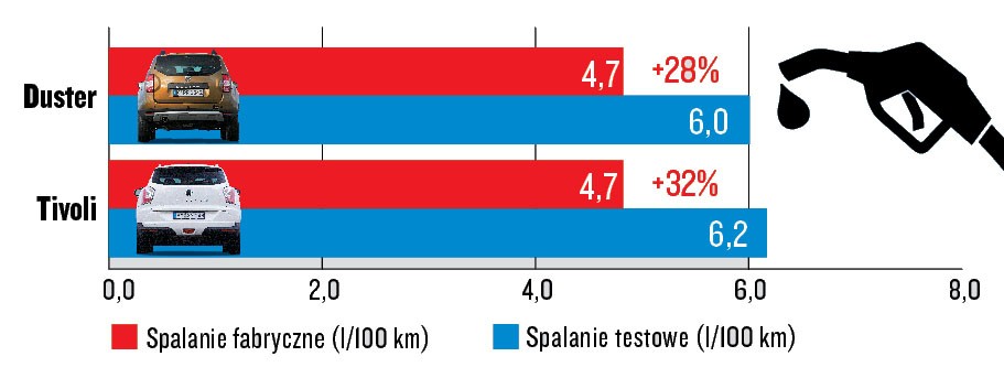 A to sporo – zamiast zatankować np. 30 l oleju napędowego właściciel SsangYonga będzie musiał wlać do baku prawie 40 litrów. Niewiele, ale jednak trochę lepiej, wygląda pod tym względem Dacia, która spaliła w teście o 28 proc. paliwa więcej, niż deklaruje producent. Apelujemy do unijnych urzędników, którym ręce aż rwą się do pracy nad mocą ekologicznego odkurzacza lub ilością wody w rezerwuarze toalety: zmieńcie wreszcie procedurę homologacyjnego testu spalania!