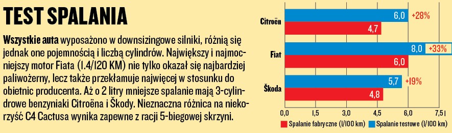 W każdym z prezentowanych aut mieliśmy drobne zastrzeżenia do jakości użytych materiałów. W górnej części deski rozdzielczej Fiata zastosowano miękkie tworzywa, w dolnej – wręcz tandetne. Cały kokpit Škody wykonano z twardych tworzyw, na szczęście solidnie je spasowano. Najmniej spodobało nam się wnętrze C4 Cactusa. Choć ma oryginalny styl, to jednak przeszkadzały nam duże połacie twardego plastiku oraz brak obrotomierza.
