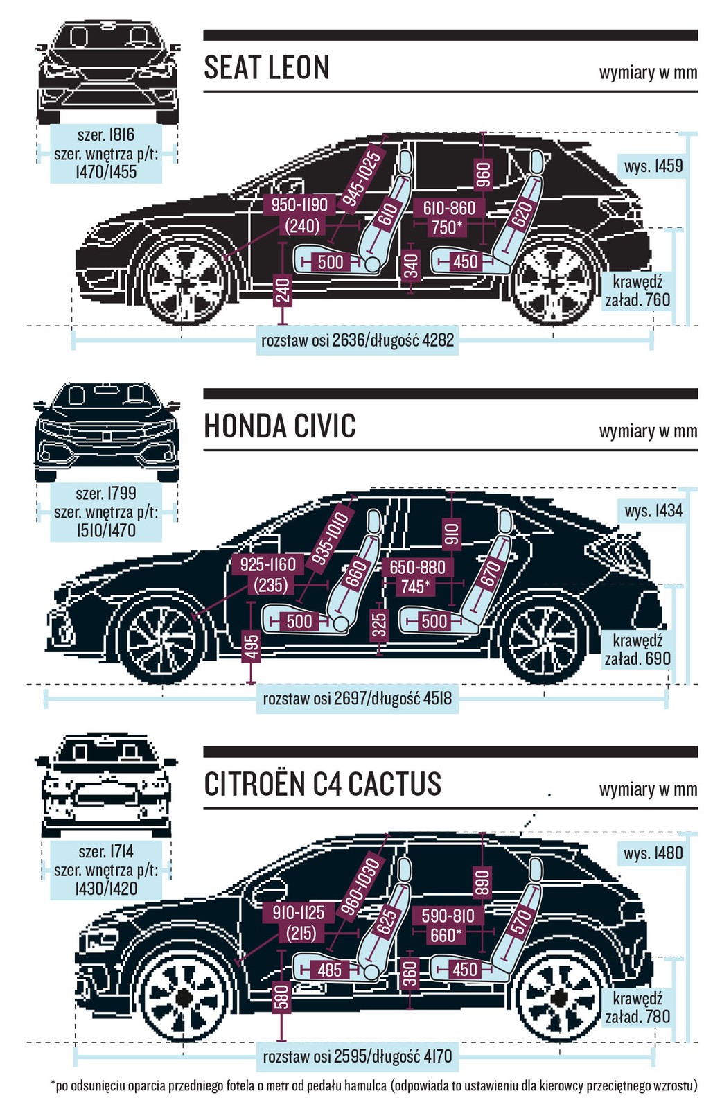 Honda Civic kontra Citroen C4 Cactus i Seat Leon - wymiary testowanych aut