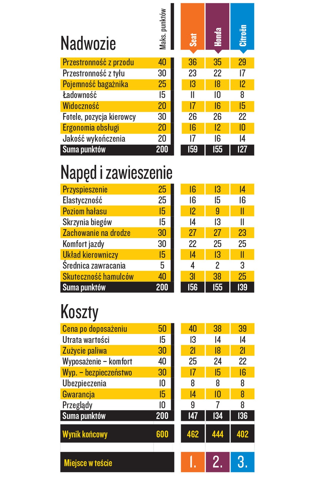 Normalność zwyciężyła! Mimo eleganckich linii karoserii bez futurystycznych akcentów (chyba że zaliczymy do tego reflektory) Leon wygrywa ze znaczną rezerwą punktów nad japońską rywalką, z kolei Seat i Honda wspólnie nokautują Citroëna, który według nas gra raczej w klasie aut klasy B. Świadczy o tym ilość miejsca na nogi na tylnej kanapie Cactusa. Nowatorska amortyzacja francuskiego auta odbiera mu pewność prowadzenia, a pod tym względem rywale nie pozwalają sobie na żadne potknięcia. Nie bez znaczenia jest też pięcioletnia gwarancja Seata.