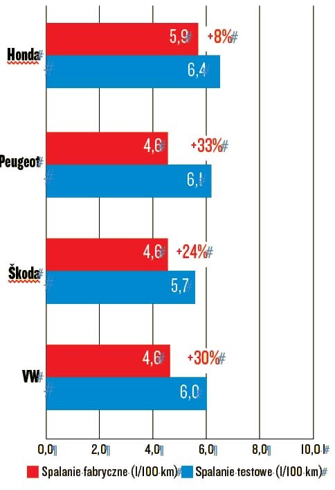 Honda Jazz, Peugeot 208, Skoda Fabia i VW Polo - spalanie testowe kontra katalogowe zużycie paliwa (różnica nie jest oceniana):