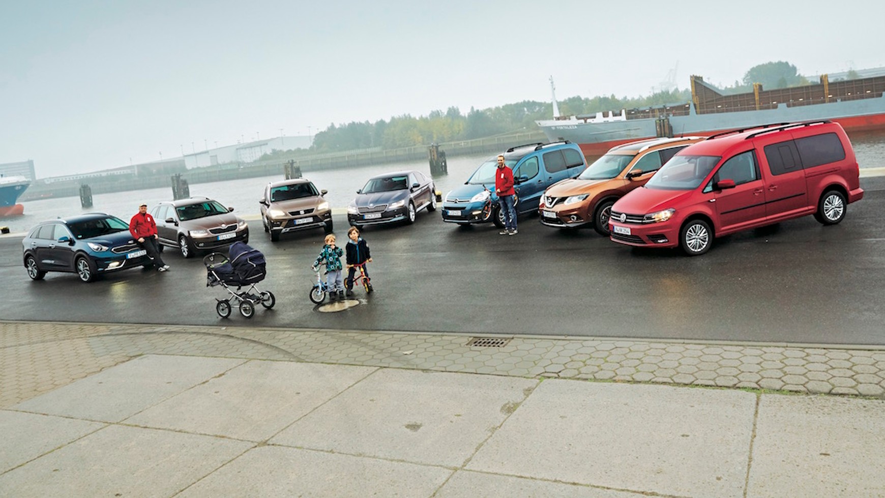Wtym porównaniu pierwsze skrzypce gra funkcjonalność, chcemy wam jednak też pokrótce zdradzić, jak testowane auta jeżdżą. Superb z opcjonalnym zawieszeniem DCC (regulacja twardości amortyzatorów) dał się ponownie poznać jako mistrz amortyzacji nierówności. Do tego proponuje rewelacyjne fotele i obszerne wnętrze. Po piętach depcze mu jednak mniejsza Octavia. Od Superba nieco odstaje komfortem jazdy, co jest spowodowane m.in. mniejszym rozstawem osi. Z kolei Citroënem przyjemniej jeździ się na krótkich dystansach, bowiem jego pudełkowate nadwozie i duże okna gwarantują dobrą widoczność i wyczucie gabarytów. Na ciasnych parkingach świetnie sprawdzają się też przesuwane drzwi. Ale w trasie denerwują zbyt krótkie siedziska foteli, a także zbyt miękkie zawieszenie, które wprawia nadwozie w bujanie. Jak można oba elementy zrobić lepiej, udowadnia Caddy. Kia Niro zachęca do spokojnej jazdy. Jej silniki spalinowy i elektryczny harmonijnie współpracują, ale do tego nie za dobrze pasuje twarde zestrojenie podwozia. Seat Ateca z kolei też dał się poznać jako sztywno zestrojone auto, lecz tutaj ta charakterystyka współgra z resztą. W bezpośrednim porównaniu z Seatem Nissan X-Trail sprawia wrażenie bardziej ociężałego auta. Pomiary to potwierdzają – mierzy o 28 cm i waży o 329 kg więcej od Seata.